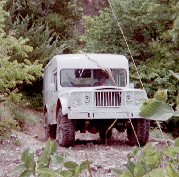 Robin's 68 Kaiser M725. Bowtie drivetrain, Dana 70 Rr, 60 Ft, 5.38's. 38.5" Swamper's with a final drive of 81:1. Says it'll go anywhere. Anyone wanna challenge that?!